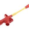 Category: probeDescription: KLEPS 60 4 mm safety clamp test probe Terminal connector: Ø 4 mm, total length: 148 mm, clamping range: Ø 4 mm, jaw opening: 3.5 mm Clamp-type test probe with grip jaws and flexible shaft. The special shape of the grip jaws allows pins and wires up to a maximum Ø 4 mm to be clamped without slipping. The Ø 4 mm socket connector means that sprung Ø 4 mm plugs are can be connected. The additional screw connection means that plugs and cables up to a maximum Ø 2 mm can be connected. Socket material: brass; grip jaws also nickel-plated. Compressive force: | 25 N ---|--- Volume resistance: | 50 mΩ permitted Temperature range: | -25 °C → +60 °C ### 4 mm Hirschmann Technical parameters - Contact material | Nickel plated brass Rated voltage | 60Vdc (unless otherwise specified) Rated current | 16A (unless otherwise specified)82871+$76.708510+$73.3733100+$72.7730250+$72.3061500+$71.57231000+$71.23882500+$70.77195000+$70.3717