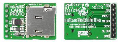 microSD 卡 PROTO 板 microSD 卡 PROTO 板特别适用于您需要更大媒体文件存储空间的情况。 带 microSD 卡插槽和 SPI 接口,您可以快速、轻松存储和传输数据。 **microSD PROTO 板的特色和优点** 可安装到所有标准原型设计板上 可与 Mikromedia 开发板一起使用 编译器支持 即用型示例 板载铁氧体电压电源滤波器,用于可靠操作 3.3 V 电源 ### 附加板